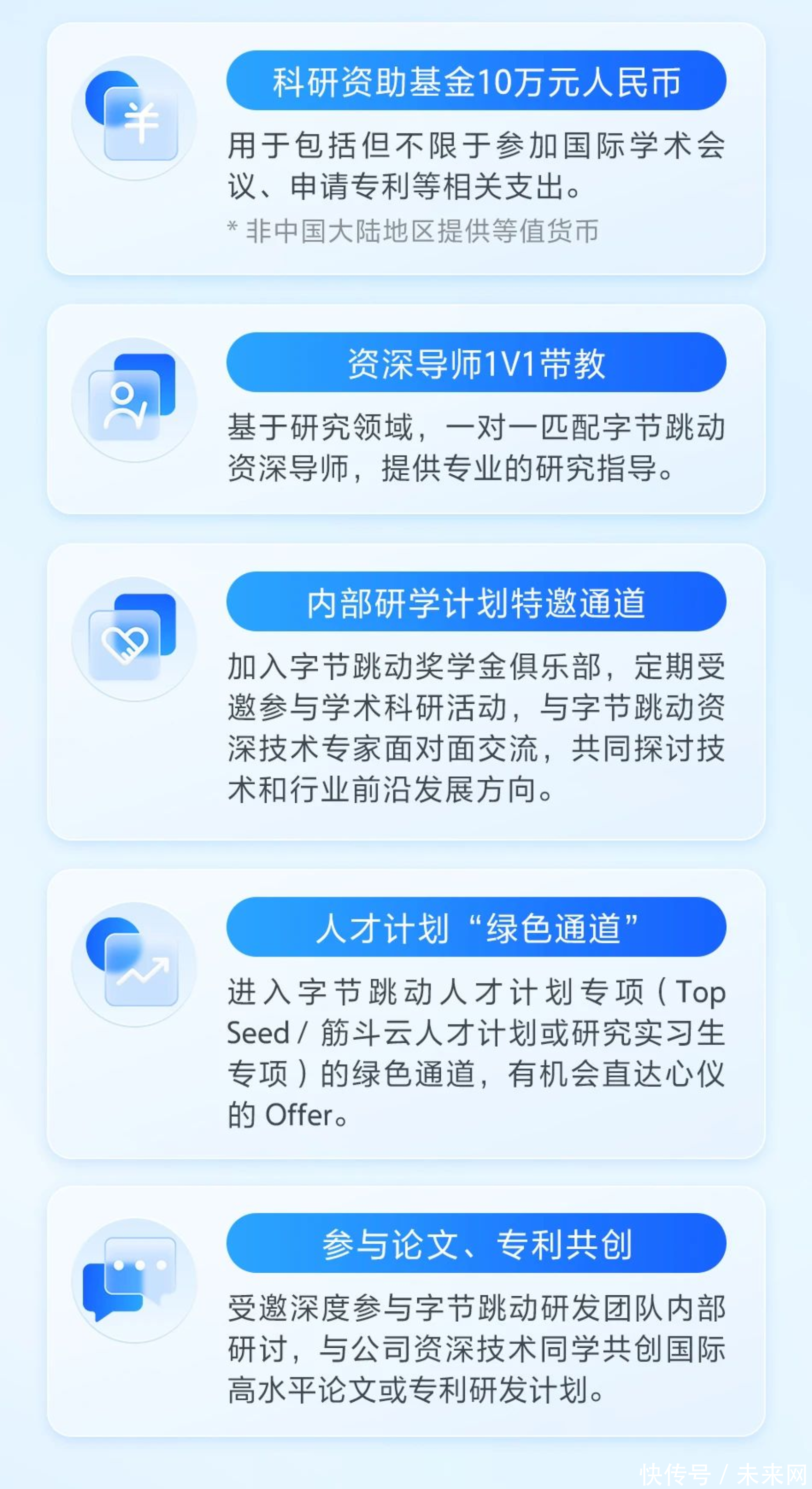 据了解,字节跳动奖学金计划是字节跳动2021年发起的一年一期的人才培养项目,每位获奖学生可获得10万元人民币(非大陆地区等值货币)科研资助基金、内部研学计划特邀通道、头部人才计划“绿色通道”等科研和职业发展支持。同时,获奖学生还将获得字节跳动资深导师1V1带教,并受邀深度参与字节跳动研发团队内部研讨,与资深技术专家共创国际高水平论文或专利研发计划。